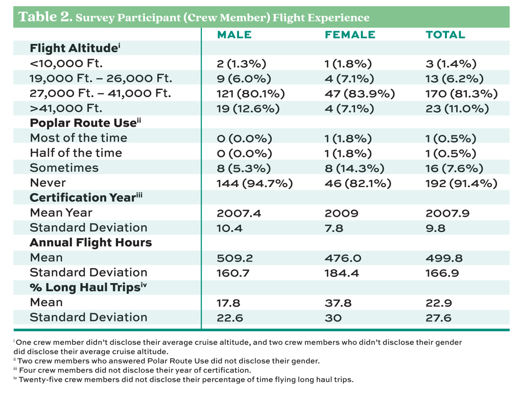 The most reported cruise altitude was 27,000-41,000 ft. (81.3%), and 23 crew members reported flying even higher at 41,000 ft. or higher (11%). A majority of crew members reported that they “never” utilized polar routes (91.4%), but 18 crew members reported utilizing polar routes at least “sometimes” (8.6%). A greater percentage of female aircrew members (17.9%) indicated that they utilized polar routes at least “sometimes” when compared to the male aircrew members (8.6%) (see Table 2). The average calendar year of commercial pilot certification was reported to be about 2008 (2007.8), with an associated average of approximately 12 years of professional flight experience at the time the survey was distributed. Average reported annual flight hours were 499.8 hours (SD = 116.9). The average reported percentage of trips that were perceived as a “long haul” (more than 4 hours flight time or 2,000 nautical miles) was 22.9% (SD = 27.6%) (see Table 2).