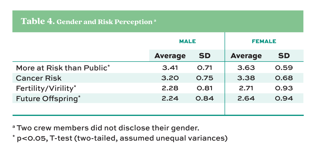 T-tests on gender and risk perception indicated female crew members had greater concern about risk from cosmic radiation (p<.05), more concern about cosmic radiation’s impact on their fertility (p<.005), and more concern for their future offspring’s health (p<.01) than their male counterparts indicated. The difference in concern for cancer among males and females was not significant (p = 0.12) (see Table 4).