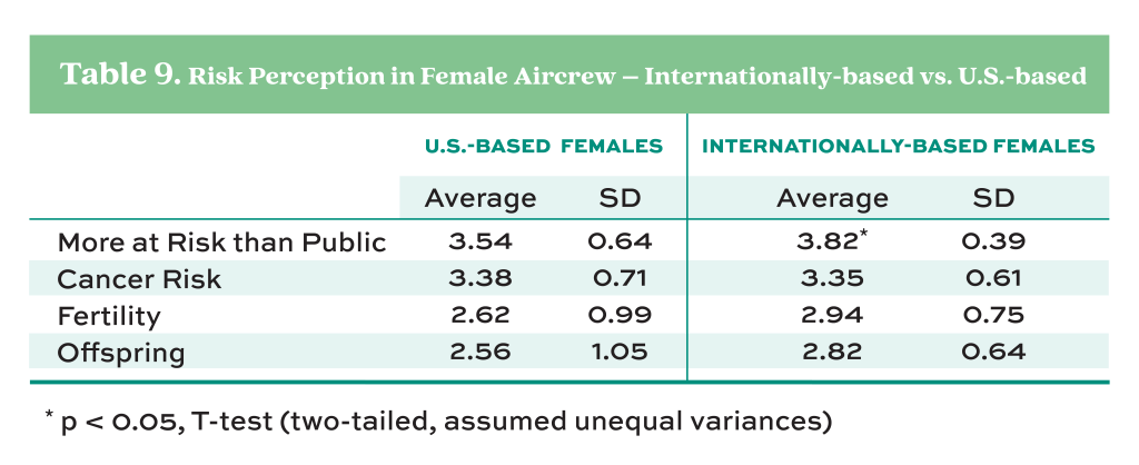 The group of female participants comprised a greater percentage of internationally-based women (30.4%) than the male group (3.3%) (see Table 1). Although being based outside the U.S. correlated with higher feelings on average risk from cosmic radiation exposure, regardless of base location, female crew members had similar perceived risk levels of developing cancer, their fertility concerns, and their concern for the health of their future offspring. When asked if crew members were more at risk from cosmic radiation exposure than the non-flying public, U.S.-based females were slightly less concerned, on average, than females based outside the U.S. (p<.05). The concern for cancer (p = 0.87), fertility (p = 0.18), and offspring (p = 0.26) between U.S. females and internationally-based females was insignificant (see Table 9).