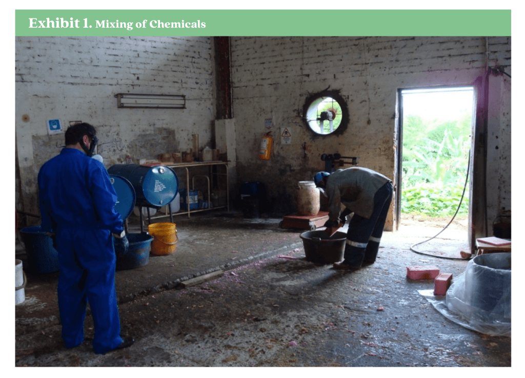 The scope of the study was to estimate the risk of TDI, tetrahydrofuran (THF), and boric acid exposure to the mattress manufacturing operators. At the time of the sampling, there were no American Industrial Hygiene Association (AIHA) accredited laboratories in South America. TDI samples are usually collected on glass fiber filters (GFFs) or impingers (or a combination of the two) based on methods developed by the Occupational Safety and Health Administration (OSHA) and the National Institute for Occupational Safety and Health (NIOSH). However, due to restrictions in sampler storage and transportation before and after sampling, in addition to the limited ability to ship the collected samples in cold conditions within 24 hours, the authors had to consider field sampling methods. Therefore, TDI colorimetric tubes and direct-read wipes for surface TDI contamination were acquired. For this project, the authors concentrated on surface sampling and detector tubes to estimate the risk of dermal exposure.
