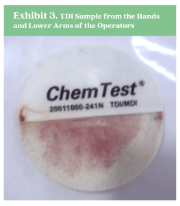The purpose of this research project is to evaluate TDI exposures utilizing field methods and colorimetric wipe samplers (direct-read wipes for surface chemical detection). The project was initiated due to skin and respiratory irritation complaints from mattress manufacturing workers in Columbia, South America. The authors wanted to answer the following research questions: Are colorimetric methods suitable for TDI risk assessment during mattress manufacturing? Is the bowtie dermal risk assessment model applicable to such a process?