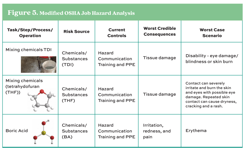 The authors proposed a new best practice model to assess the dermal exposure risks. This new model addresses the multiple chemical risks associated with the current state of mattress production. This model can be easily applied to other scenarios where multiple chemical exposures exist. The approach starts with risk identification. Using a modified OSHA Job Hazard Analysis form is shown in Fig. 5.