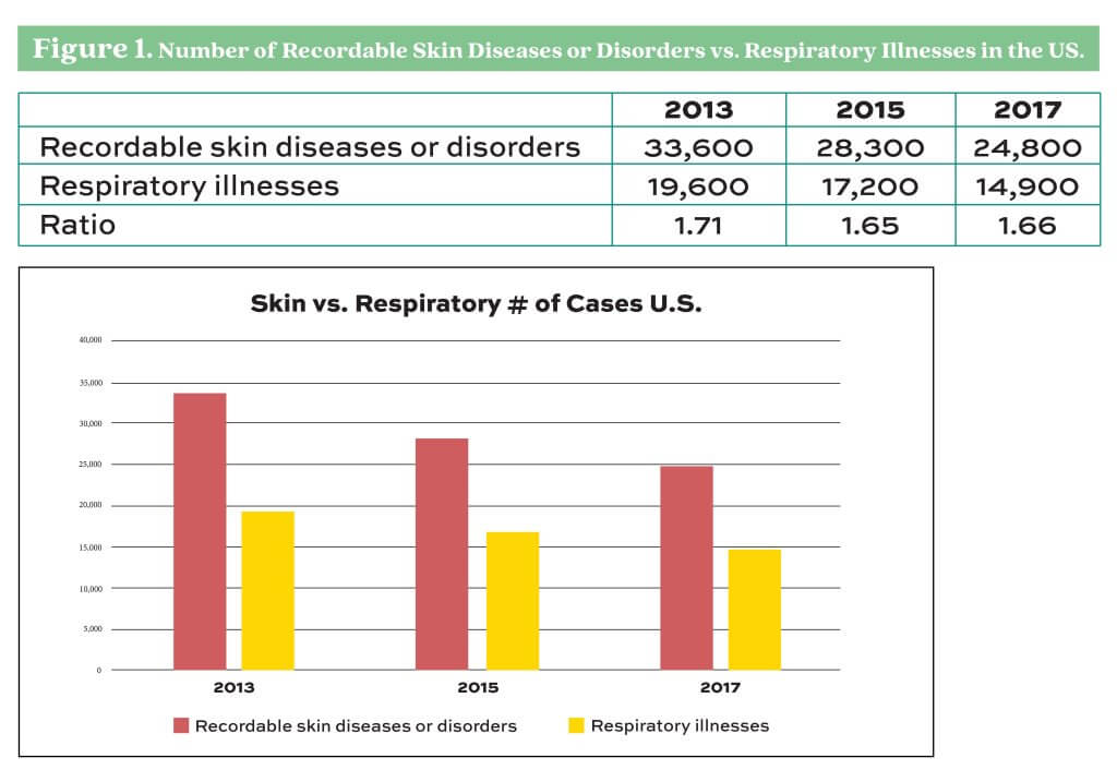 Dermal exposure to harmful substances in an occupational setting is a significant problem globally. According to OSHA (2017), the number of cases and the rate of skin disease in the U.S. exceeds recordable respiratory illnesses. According to the latest detailed data available from the Bureau of Labor Statistics (BLS) in 2017, 24,800 recordable skin diseases or disorders were reported at a rate of 2.2 diseases or disorders per 10,000 employees, compared to 14,900 respiratory illnesses with a rate of 1.3 illnesses per 10,000 employees.