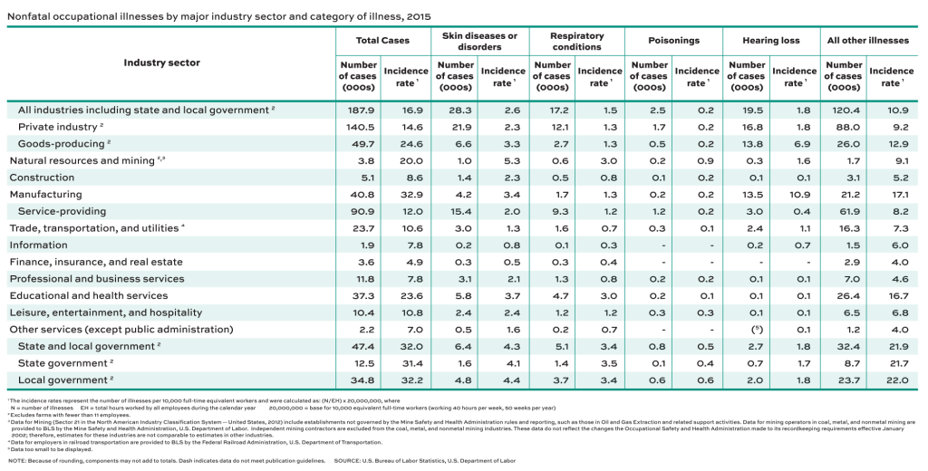 Table SNR07, Nonfatal Occupational Illnesses by Major Industry Sector and Category of Illness,U.S. Bureau of Labor Statistics, from https://www.bls.gov/.../nonfatal...illnesses-tables/.../supplemental-table-7-20... www.bls.gov › iif › supplemental-table-7-2017-national, 2017.