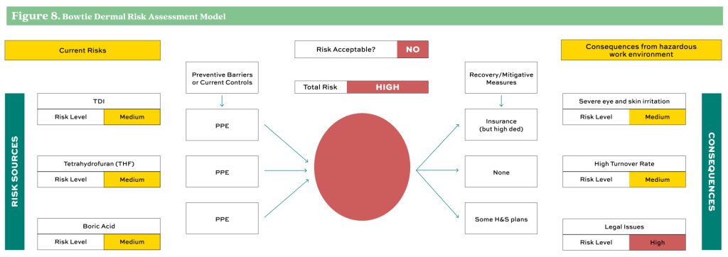 For this case study, the researchers focused preliminary on the dermal exposure. The readers are encouraged to identify other occupational risks, but the authors wanted to point out the applicability of the Bowtie DRAM. The following chemicals were addressed in the study: toluene diisocyanate (TDI), tetrahydrofuran (THF), and boric acid.