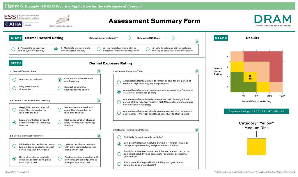 There are a number of dermal risk assessment models available. However, one of the most user-friendly models is the Dermal Risk Assessment Model (DRAM)™ (AIHA, 2022). This tool provides a systematic screening evaluation of the relative risks of dermal exposure to material and may be especially useful for the purposes of prioritizing additional analysis for specific materials or scenarios. It runs only in Microsoft Excel (with macro-enabled mode) but requires no other software. What is unique about this tool is the fact that it includes a deterministic (single value inputs) option and a Monte Carlo simulation (distributions of input values) option.