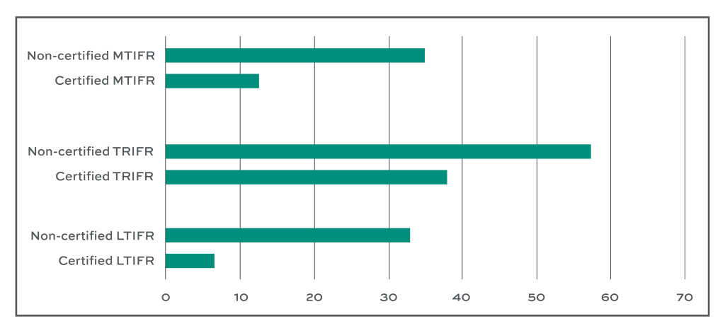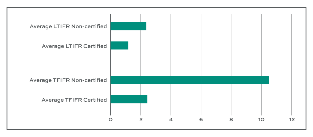 An analysis of the ESG data from 100 organizations revealed significant differences in safety performance between certified and non-certified organizations. Certified organizations reported lower TRIFR and LTIFR compared to non-certified organizations (Fig. 1). Specifically, certified organizations recorded an average TRIFR of 2.29 per 1,000,000 hours, while non-certified organizations reported an average TRIFR of 10.4 per 1,000,000 hours. Certified organizations recorded an average LTIFR of 1.16 per 1,000,000 hours, whereas non-certified organizations reported an average LTIFR of 2.21 per 1,000,000 hours.