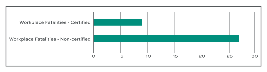 The collected ESG workplace fatality data revealed that certified organizations reported fewer workplace fatalities compared to non-certified organizations (Fig. 2). Organizations certified to standards such as the old OHSAS 18001 or the new ISO 45001 recorded 11 workplace fatalities, whereas non-certified organizations reported 45 workplace fatalities.
